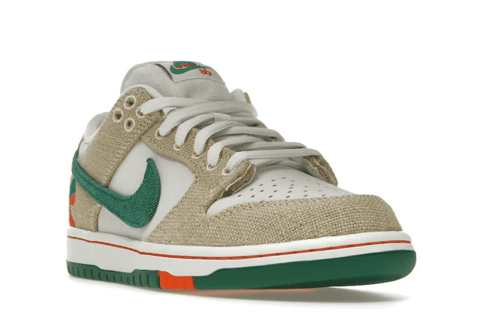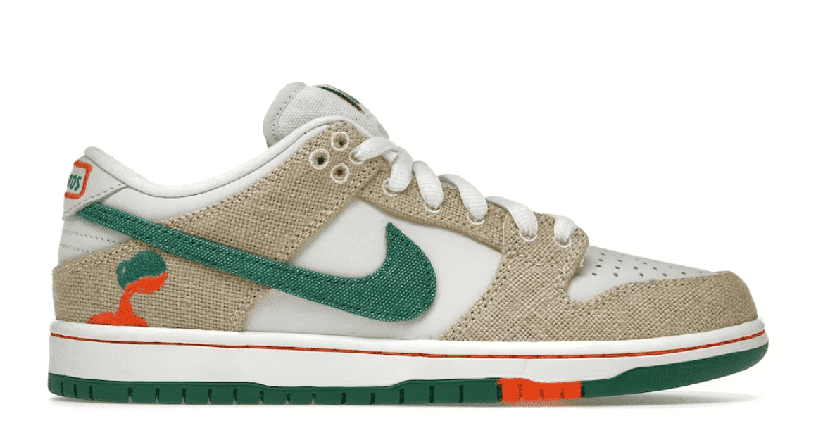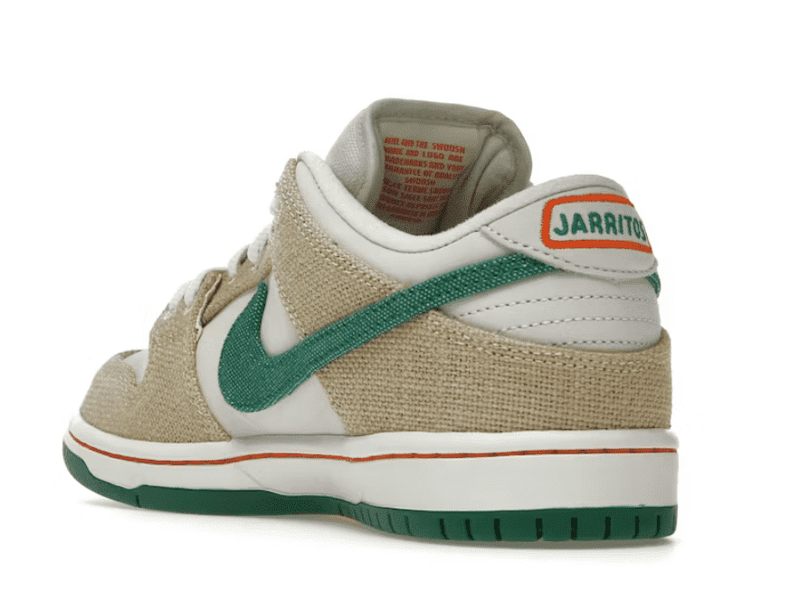 Descubre las Nike SB Dunk Low Jarritos, una fusión única de estilo y tradición. Con una base de cuero blanco y paneles de paño beige, su diseño rinde homenaje a las bolsas de cosecha de frutas. Destacan el swoosh en lienzo verde y el bordado de bebida en el talón. ¡Lo mejor! Los paneles de lienzo son personalizables: córtalos y revela un vibrante naranja. Perfectas para los amantes de las sneakers, estas Dunks combinan historia, creatividad y originalidad. No esperes más y añade este par exclusivo a tu colección. ¡Haz tuyo un ícono del streetwear!